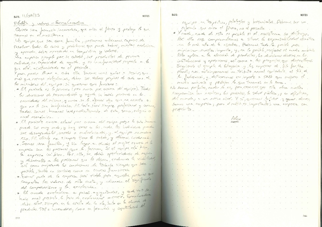 Un día, Alex, titular actual de la farmacia y ortopedia, se sentó para reflexionar sobre lo que quería que fuera la Farmacia Ortopedia Lacadena. Inspirado por la carta de Jerry Mander, empleado y compañero de Yvon Chouinard, fundador de Patagonia y 1% for the Planet, en la que establecían los valores de su empresa.